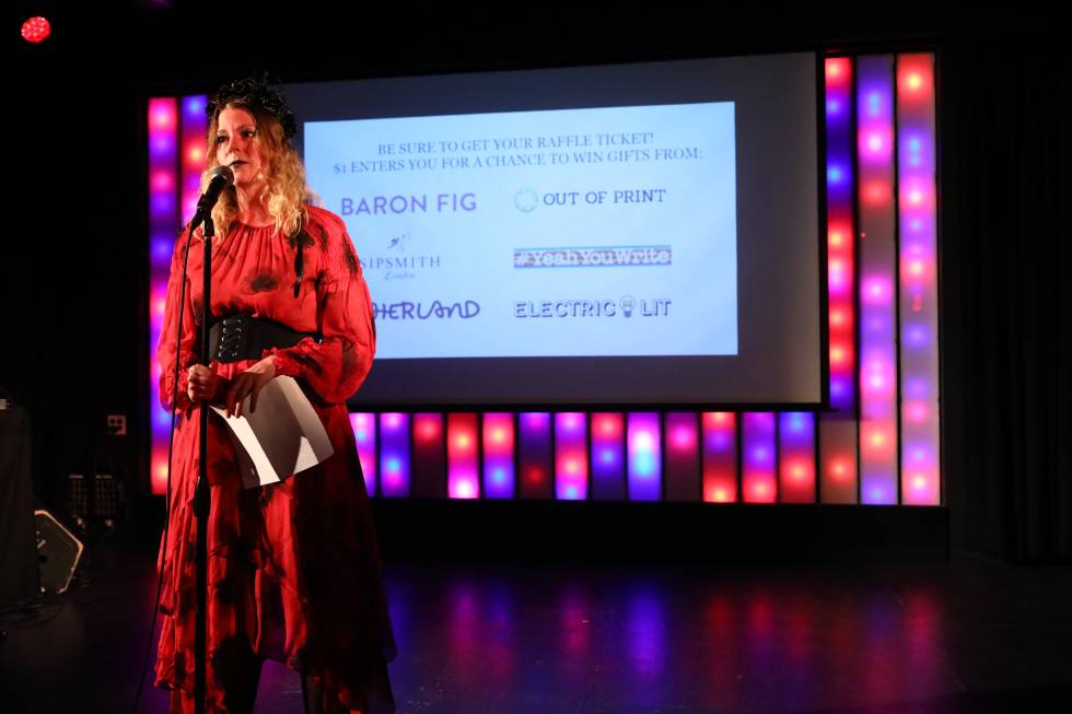 Halimah Marcus at the Electric Literature Ball with Raffle Donors stage
